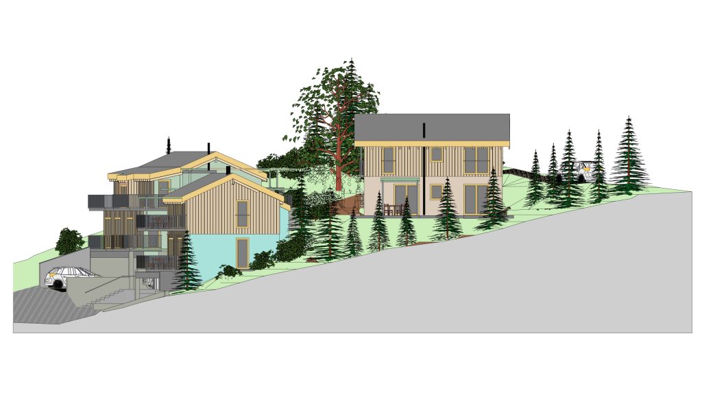 Das Klippitztörl ist ein Feriendomizil mit Winter- und Sommersaison. Die bevorzugte Wohnform ist hier das Ferienhaus oder Chalet wie es mit internationalem Blick gern genannt wird. Die Bauaufgabe in diesem Fall war jedoch die Planung von Wohnungen, wobei als Gesamteindruck kleinteilige Baukörper mit einer zurücktretenden Verbindung von Stiegenhaus und Lift entstehen sollen. Die Baumaterialien sind in erster Linie Holz natur, Sichtbeton und verschiedenfärbig geastaltete Putzflächen. Durch die Grundrissgestaltung wird versuchen trotz guter Ausnutzung und direkter Pistennähe des Grundstückes, Intimität für die einzelnen Wohnungen zu erreichen.